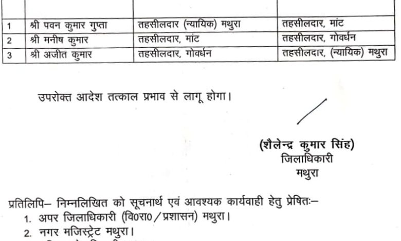 मथुरा। जिलाधिकारी शैलेंद्र कुमार सिंह ने मथुरा में कई डिप्टी क्लेक्टर और तहसीलदारों के कार्य क्षेत्र में बदलाब करते हुए…