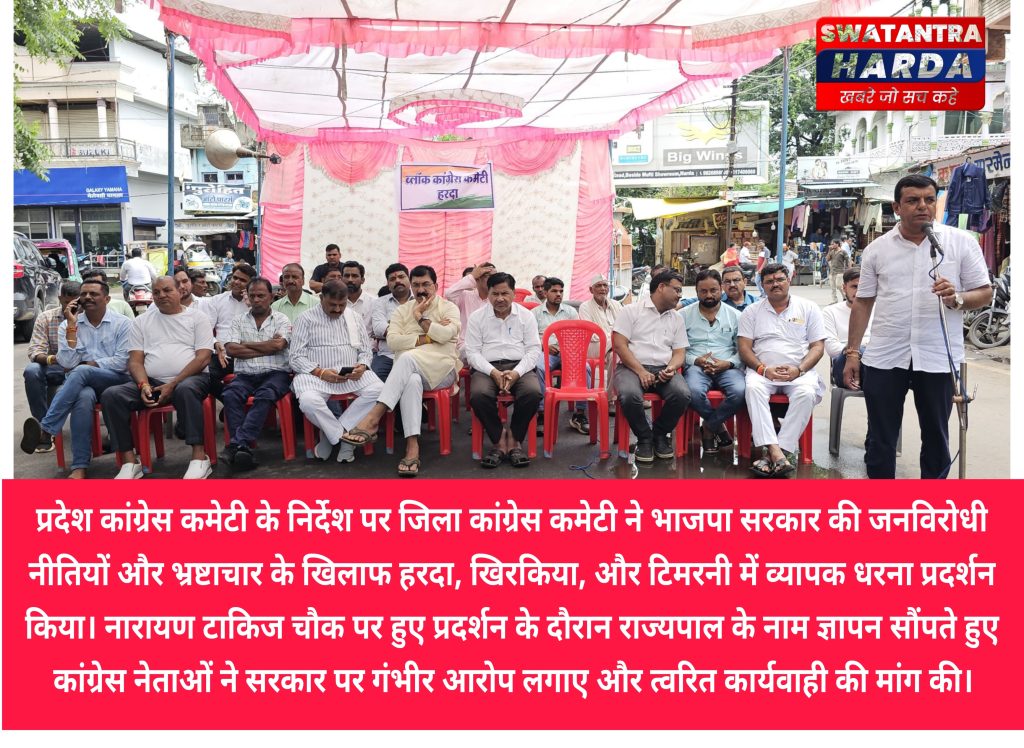 जनविरोधी नीतियों, बिगड़ती कानून व्यवस्था, और किसान विरोधी कार्यों का आरोप लगाते हुए कहा गया कि सरकार किसानों को उचित मुआवजा और बढ़ी हुई दरों पर फसलों की खरीद सुनिश्चित नहीं कर रही है। साथ ही, बिजली के बढ़े हुए बिल, महिलाओं पर अत्याचार, और दलित-आदिवासियों पर अत्याचार रोकने की मांग की गई।जिला कांग्रेस अध्यक्ष ओम पटेल ने अपने संबोधन में कहा कि प्रदेश में महिलाओं और किसानों पर अत्याचार हो रहा है, लेकिन सरकार सुनने को तैयार नहीं। हरदा विधायक डॉ. रामकिशोर दोगने ने आरोप लगाया कि भाजपा सरकार की नीतियां भ्रष्टाचार में डूबी हुई हैं और प्रदेश का विकास रुक गया है। ब्लॉक कांग्रेस अध्यक्ष गोविंद व्यास ने कहा की सरकार पर गरीबों और वंचितों के हितों को नजरअंदाज करने का आरोप लगाया और कहा कि भाजपा सरकार किसान और मजदूर विरोधी है। कांग्रेस ने मांग की है कि राज्यपाल, भाजपा सरकार को इन मुद्दों पर तुरंत कार्यवाही करे । इस दौरान दिनेश यादव, राहुल पटेल, अमर रोचलानी, राजेश पटेल, सुरेन्द्र सराफ़, राकेश सुरमा, संजय अग्रवाल, मुन्ना पटेल, धर्मेन्द्र चौहान, रमेश सोनकर, अजय सिंह राजपूत, योगेश चौहान, दीपक वशिष्ठ, अक्षय उपरित, संदीप गौर, जावेद पटेल, महेश राठौर, सुनील गीते, नितिन पाल, इकबाल खान, शाहरुख खान, श्यामलाल गंगवाल, पूनम यादव सहित अन्य कांग्रेसजन उपस्थित रहें।