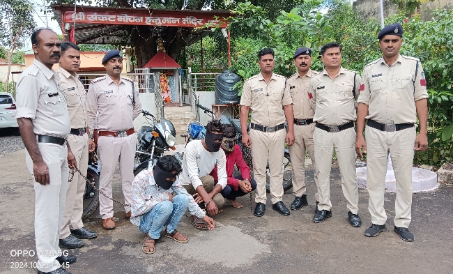 शनिवार को पुलिस को मुखबिर से सूचना मिली कि छीपानेर रोड स्थित शराब दुकान के पास तीन संदिग्ध व्यक्ति चोरी की मोटरसाइकिल एचएफ डिलक्स से घूम रहे हैं। पुलिस टीम ने तत्परता दिखाते हुए मौके पर दबिश दी और तीनों आरोपियों—