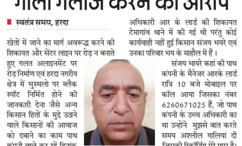 स्वतंत्र हरदा : संजय भायरे प्रेस नोट जारी करते हुए कहा कि खेतों में जाने का मार्ग अवरूद्ध करने की शिकायत और सेंटर लाइन पर रोड़ न बनाते हुए गलत अलाइनमेंट पर रोड़ निर्माण एवं हरदा नगरीय क्षेत्र में भुस्थलो पर ब्लैक स्पॉट निर्मित होने की जानकारी देना जैसे अन्य किसान हितों के मुद्दे उठाने वाले किसानों की आवाज को दबाने का काम पाथ कंपनी वाले कर रहें दिनांक 27 जनवरी को किसान संजय भायरे को गंदी गालियां देकर जान से मारने की धमकी दी गई जिसकी शिकायत कर एफ आई आर की मांग हरदा थाने में संजय भायरे द्वारा की गई है ज्ञात हो की पूर्व में भी किसानों को धमकाने के मामले में पाथ कंपनी के अधिकारी आर के लार्ड की शिकायत टेमागांव थाने में की गई थी परंतु कोई कार्यवाही नहीं हुई किसान संजय भयरे एवं उनका परिवार भय के माहौल में हैं ।