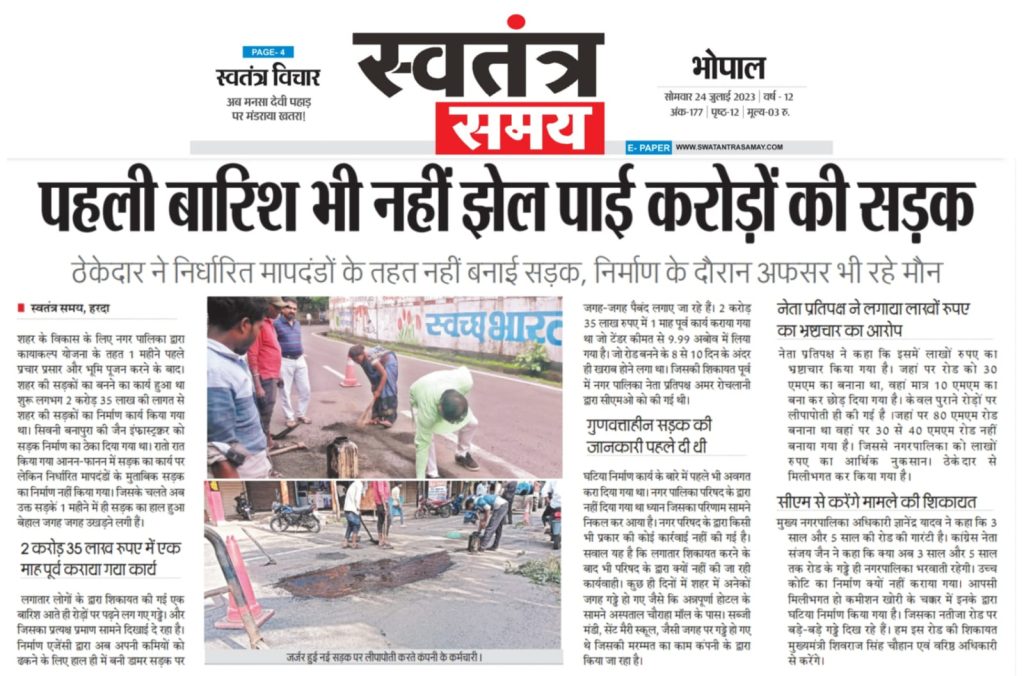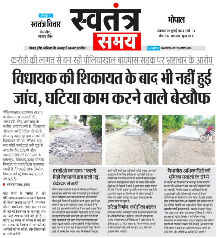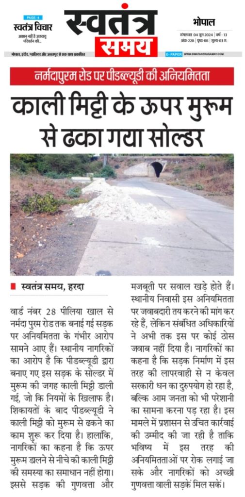 स्वतंत्र हरदा। दिनांक 11 जनवरी 2024 को वार्ड क्रमांक 28 में पीलिया खाल से नर्मदापूरम मुख्य मार्ग तक बनने वाली सीसी रोड के घटिया निर्माण और भ्रष्टाचार की शिकायत दर्ज कराई गई थी। यह शिकायत कांग्रेस के विधायक आर.के. दोगने, नेता प्रतिपक्ष अमर रोचलानी, और अन्य कांग्रेस पार्षदों ने मिलकर की थी। शिकायत के अनुसार, इस सड़क निर्माण में करीब ₹2 करोड़ 35 लाख का भ्रष्टाचार हुआ है। शिकायत में कुल 12 बिंदुओं पर जांच की मांग की गई थी।
